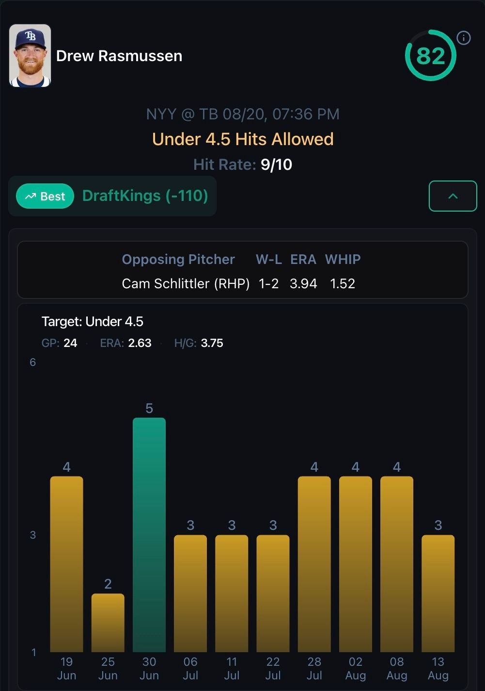 Drew Rasmussen’s UNDER 4.5 hits allowed at -110 on DraftKings comes with strong backing from both trends and matchup history. He’s been sharp at limiting contact, averaging 3.6 hits per game over his last five and 3.75 on the season, staying under this number in 9 of his last 10 starts. Rasmussen has held the Yankees in check this year as well, allowing just 4 hits in one start and 3 in another, showing he matches up well against their lineup. With three straight unders and consistency in keeping opponents under 5 hits, the 82 confidence score reflects a favorable spot for him to continue that trend.
