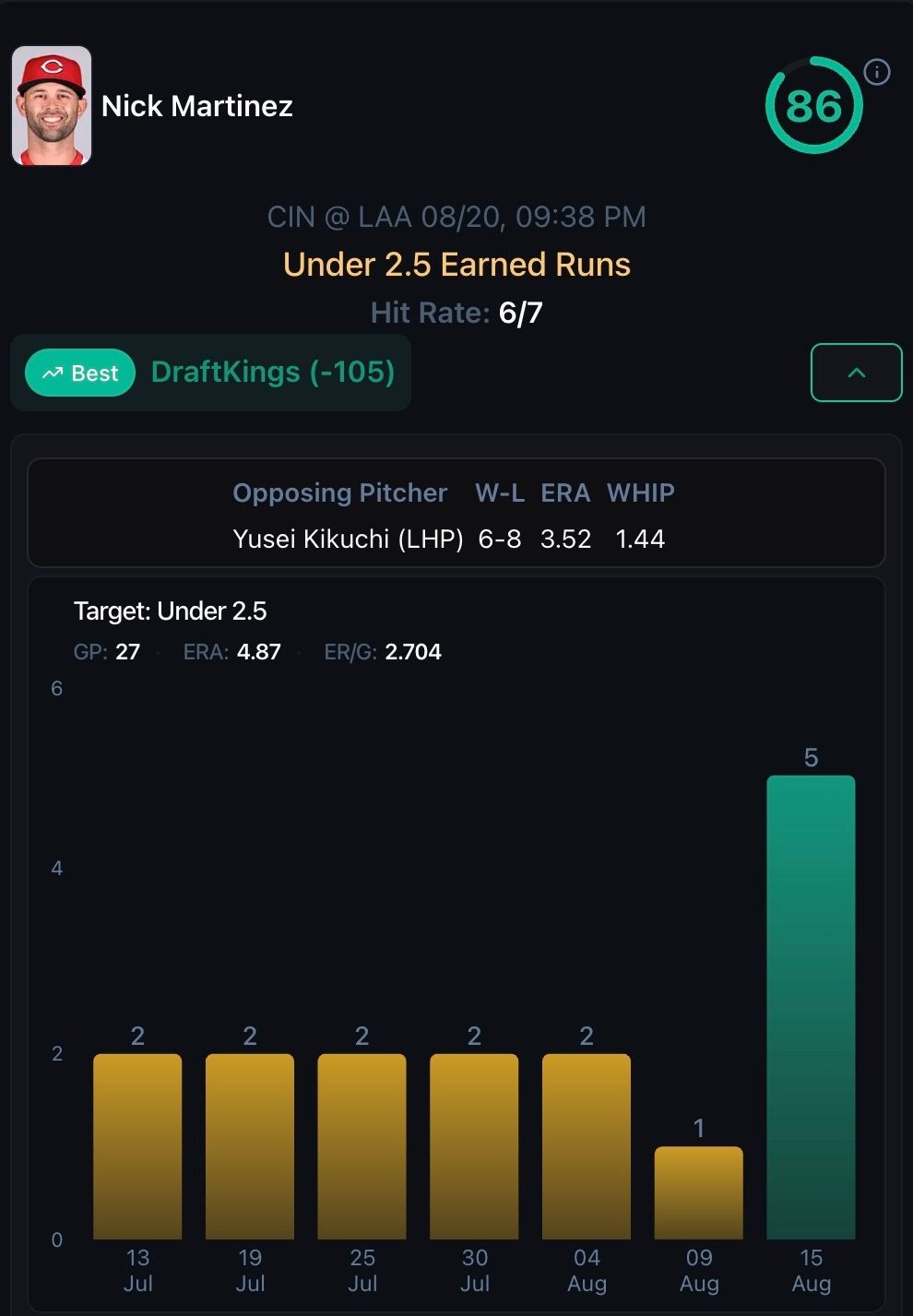 Nick Martinez’s UNDER 2.5 earned runs at -105 on DraftKings looks like a strong bounce-back spot despite a rough last outing. He’s been steady overall, averaging 2.4 ER/G over his last five starts and 2.704 on the season, with 6 of his last 7 games staying under this line. While he did allow 5 earned runs in his most recent start, his last 3-game average sits at 2.67 ER/G, showing that performance was more of an outlier. The matchup is manageable as well, with the Angels averaging 4.41 runs per game this season, slightly above league average but not an overwhelming offense. Martinez’s consistency in limiting damage, especially compared to this modest run-producing opponent, supports the 86 confidence score and makes this a solid under look.