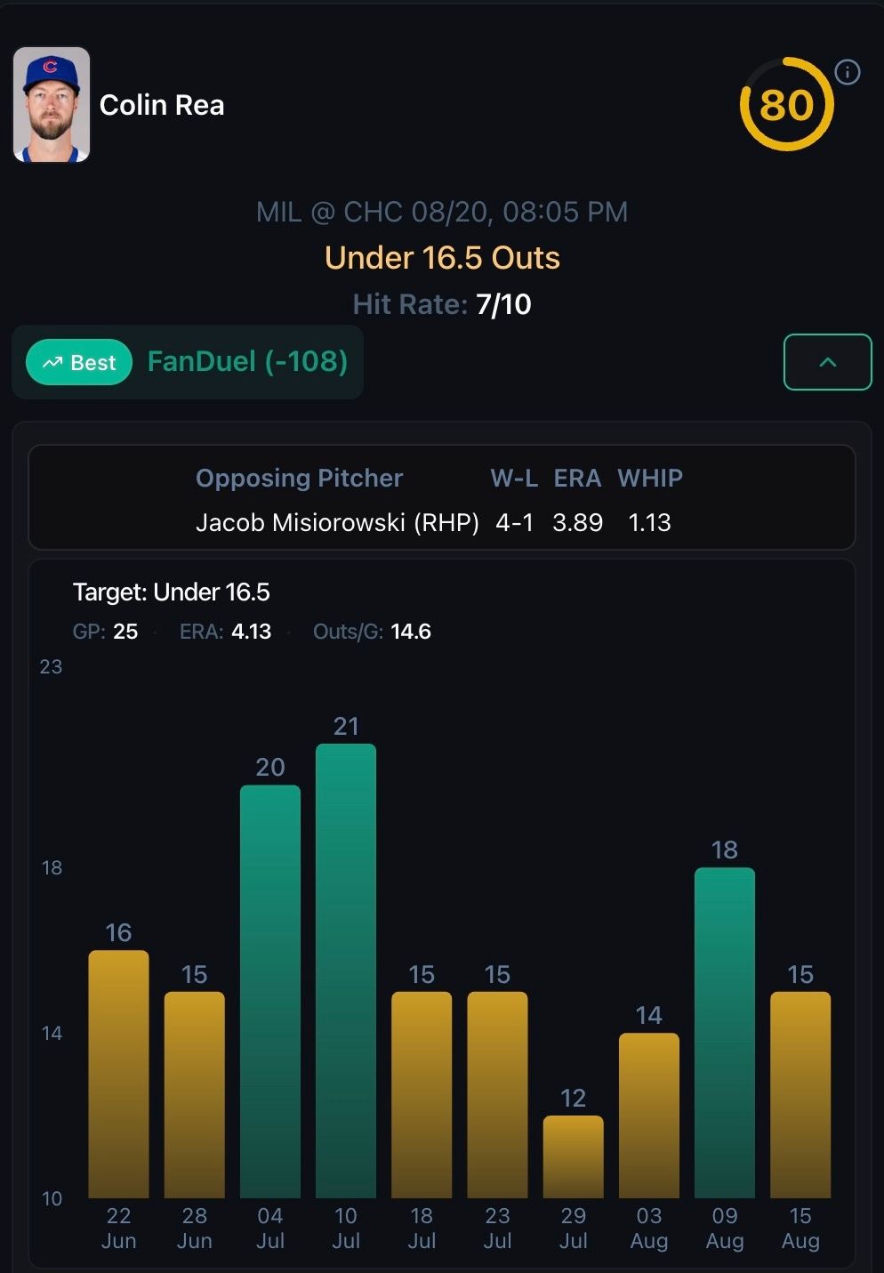 Colin Rea’s UNDER 16.5 outs at -108 on FanDuel lines up with both his recent workload and the Brewers’ offensive form. He’s averaging 14.8 outs over his last five starts and 14.6 on the season, consistently coming up short of the 17 needed to clear this line. Rea has stayed under in 7 of his last 10 outings, including 4 of his last 5, and enters with a 4.13 ERA that suggests he’s been hittable. The matchup makes things tougher as well with the Brewers are averaging 5.16 runs and 8.78 hits per game on the season, and over their last 10 they’ve held opposing starters to just 13.7 outs per game. With a lineup that makes pitchers work and Rea’s track record of shorter outings, the 80 confidence score reflects solid value on the under here.