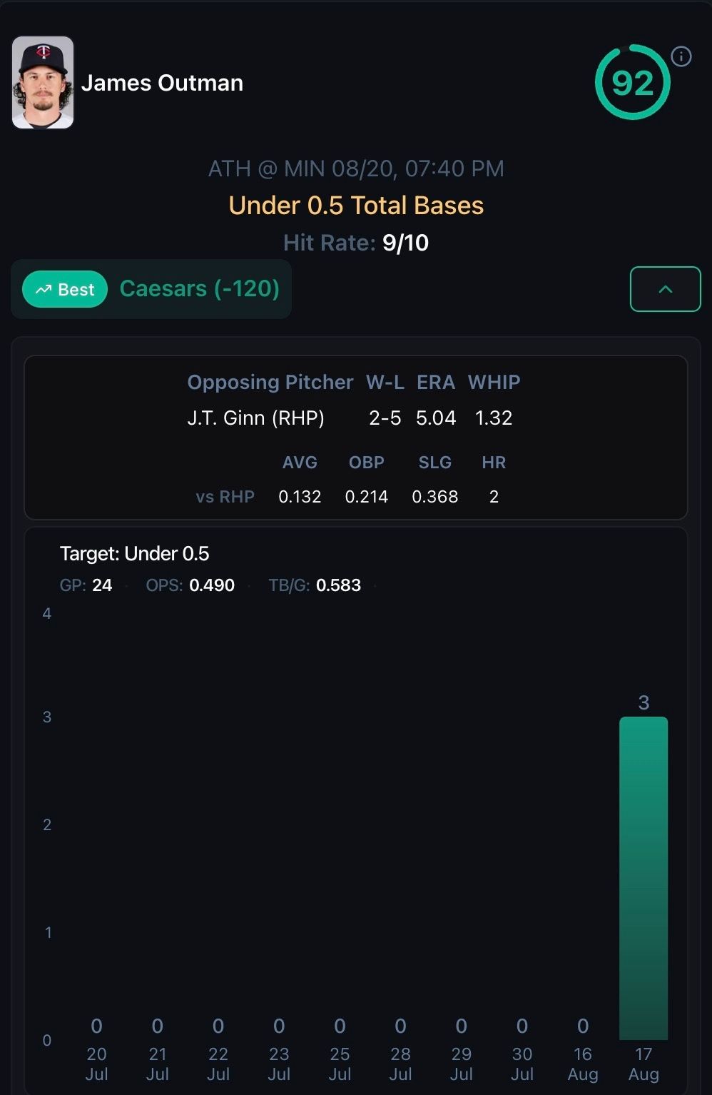 August has been a winning month so far, and the goal now is to keep that momentum rolling. The trends are pointing squarely toward the unders, with pitching matchups and offensive form lining up for value spots across the slate. Today’s card features Rea under outs, Outman under total bases, Martinez under earned runs, and Rasmussen under hits allowed, each backed by strong data and recent performance. We’ll stick to the game plan, trust the trends, and look to keep stacking green.