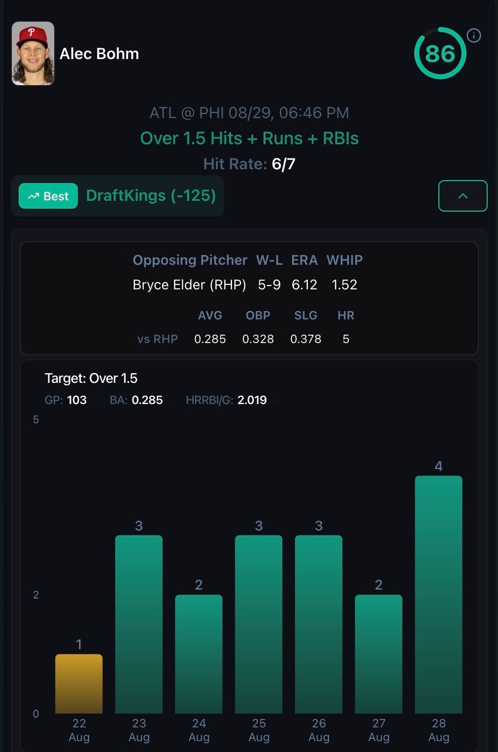 Alec Bohm’s OVER 1.5 Hits + Runs + RBIs at -125 on DraftKings is backed by strong recent form. He’s cleared this line in 6 of his last 7 games, averaging 2.8 H/R/RBIs over his last five compared to his 2.019 season average. Bohm owns a .285 average vs RHP and faces Bryce Elder, who’s struggled with a 6.12 ERA and allowed 28 hits and 19 ER over his last five starts, including 8 hits and 9 ER in just 2 innings against the Phillies. With Bohm locked in and Elder vulnerable, the 86 confidence score supports the over.
