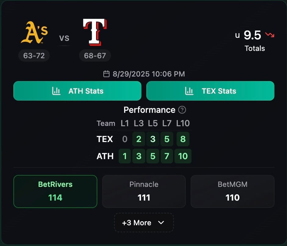 1. 📉 Rangers @ Athletics UNDER 9.5 Total Runs (+114 BetRIvers)