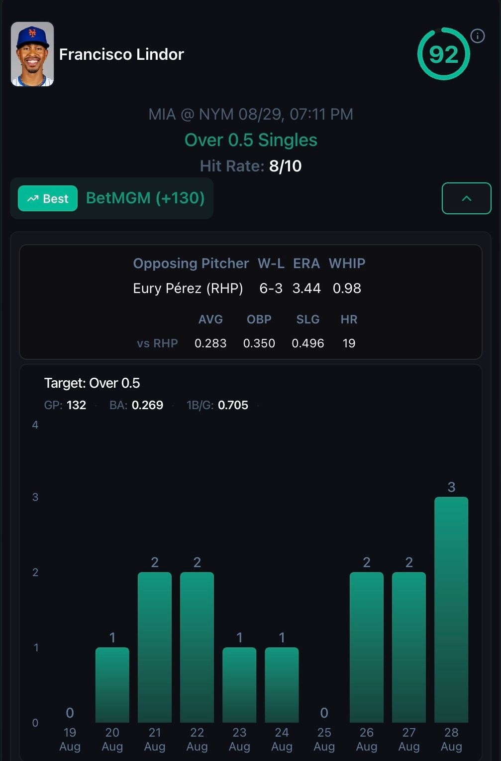 Francisco Lindor’s OVER 0.5 singles at +130 on BetMGM offers strong value with recent production and matchup support. He’s been piling up base hits, recording singles in 8 of his last 10 games, including each of his last three, while averaging 2.33 singles over his last three games and 1.6 over his last five, more than double his 0.705 season average. Lindor owns a .350 OBP against right-handed pitching and will face Eury Pérez, who has allowed 17 hits over his last five starts. Even if Pérez keeps him in check, Miami’s bullpen has been shaky, giving up 15 hits across their last three games, creating added opportunity. With multiple paths to reach base and plus-money value, the 92 confidence score highlights this as a strong play.