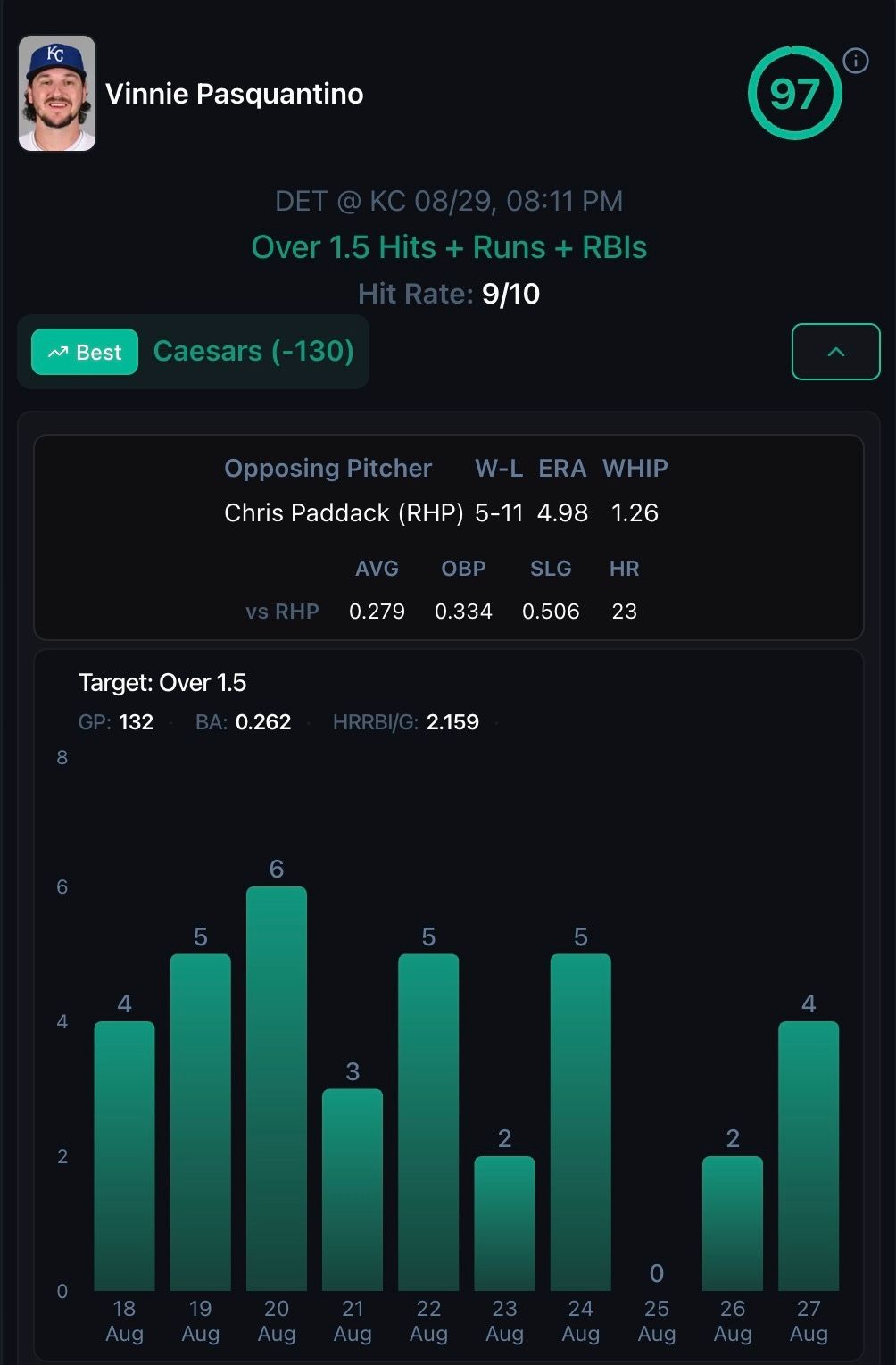 Vinnie Pasquantino’s OVER 1.5 Hits + Runs + RBIs at -130 on Caesars is backed by both recent form and matchup. He’s cleared this number in 9 of his last 10 games, averaging 2.6 H/R/RBIs over his last five, well above his 2.159 season average. Pasquantino owns a .840 OPS vs RHP and faces Chris Paddack, who’s struggled with a 4.97 ERA and has allowed 26 hits and 15 runs over his last five starts. With his bat hot and Paddack giving up steady contact, the 97 confidence score reflects strong value on this over.