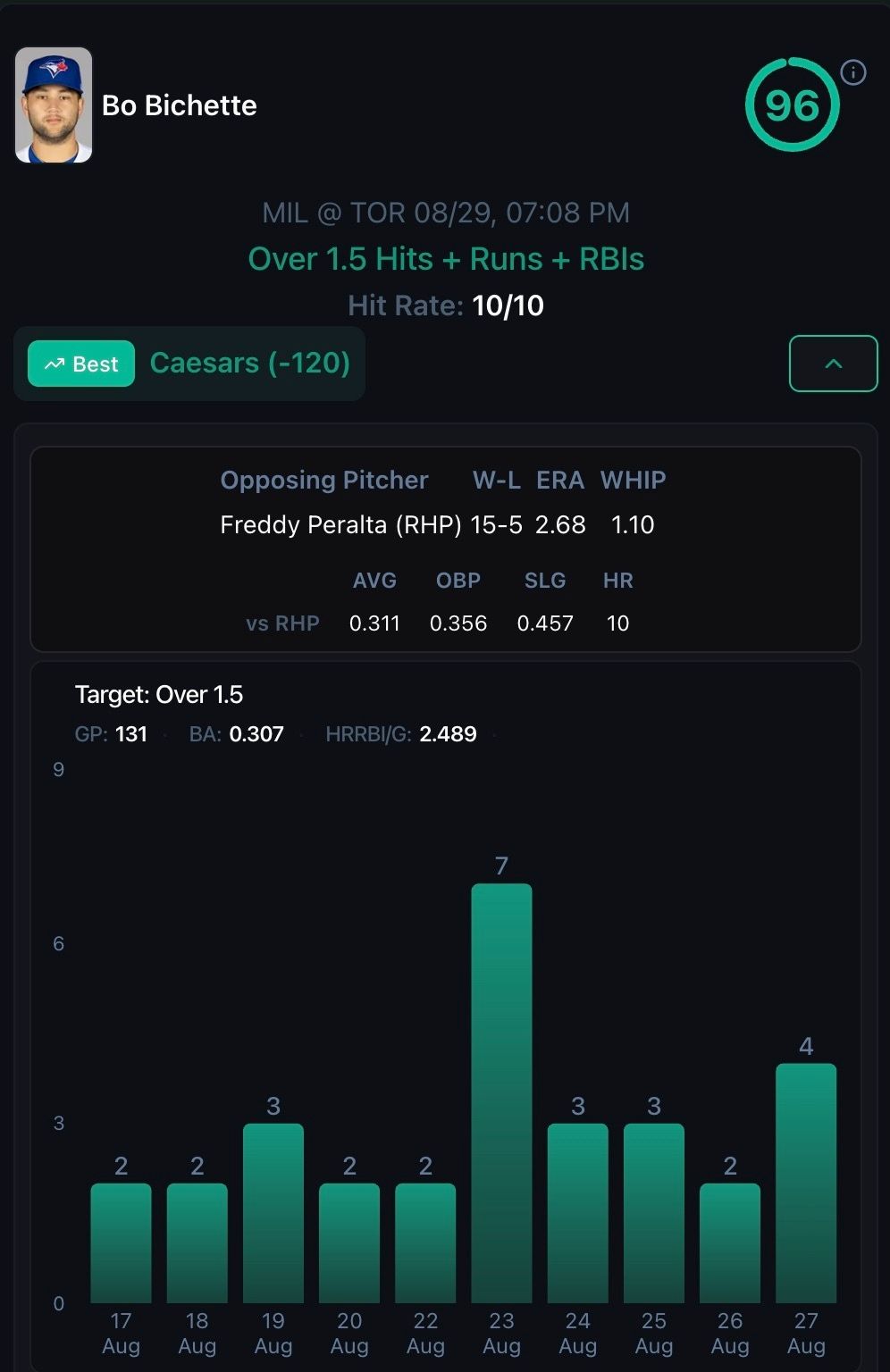 Bo Bichette’s OVER 1.5 Hits + Runs + RBIs at -120 on Caesars is backed by elite recent form. He’s cleared this number in 10 straight games, averaging 3.8 H/R/RBIs over his last five, far above his 2.489 season average. Bichette has been scorching hot in August with a .996 OPS, 37 hits, and 19 RBIs, making him one of the most productive bats in baseball right now. He owns a .311 average vs RHP and gets Freddy Peralta, who despite not allowing a run in his last three starts, has shown volatility this season with outings of 7 hits and 5 ER allowed. With Bichette locked in and multiple paths to cash, the 96 confidence score makes this a strong over play.