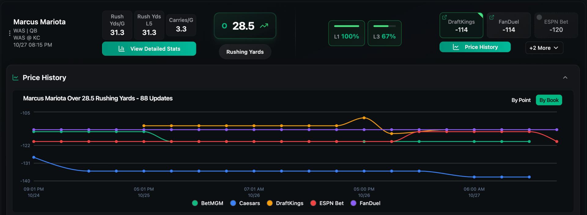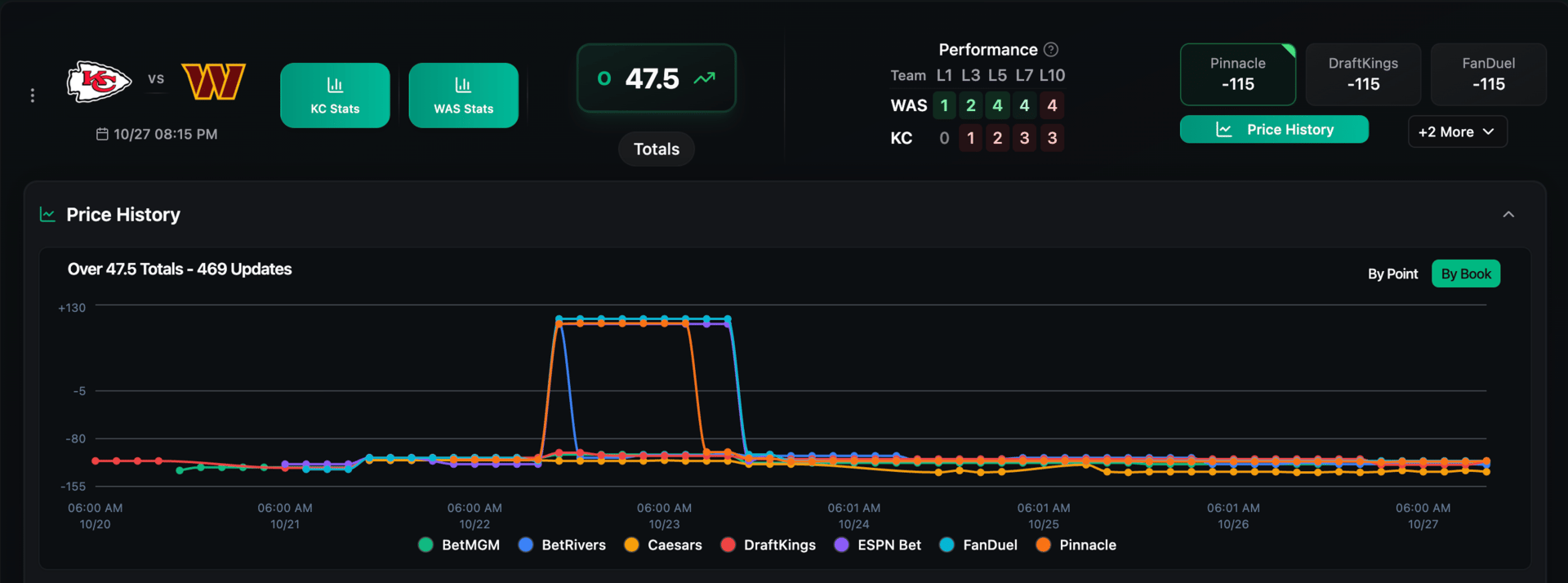 All data points are sourced through WagerLens, providing near real-time odds comparison and historical performance metrics across major sportsbooks.