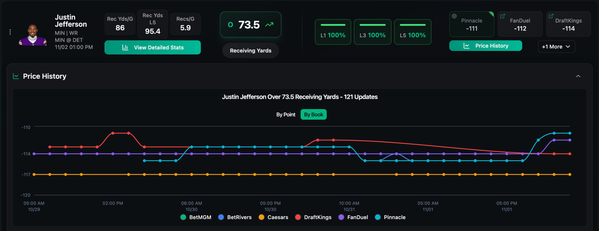 Justin Jefferson’s receiving line of 73.5 yards looks like one of the stronger overs on the slate given his elite consistency and matchup upside. He’s cleared this mark in five straight games, averaging 95.4 yards over his last five and 92 per game across his last three, while sitting at 86 on the season. Jefferson remains the focal point of Minnesota’s passing attack, averaging nearly 6 receptions per game at a strong 14.7 yards per catch, giving him steady volume and explosive play potential. The matchup also aligns well, Detroit is allowing 212.3 passing yards per game and has struggled against top-tier wideouts, giving up 110 yards to Ja’Marr Chase and 128 to Rome Odunze earlier this year. With Jefferson’s route volume and proven track record against aggressive secondaries, 73.5 looks a few yards too low.