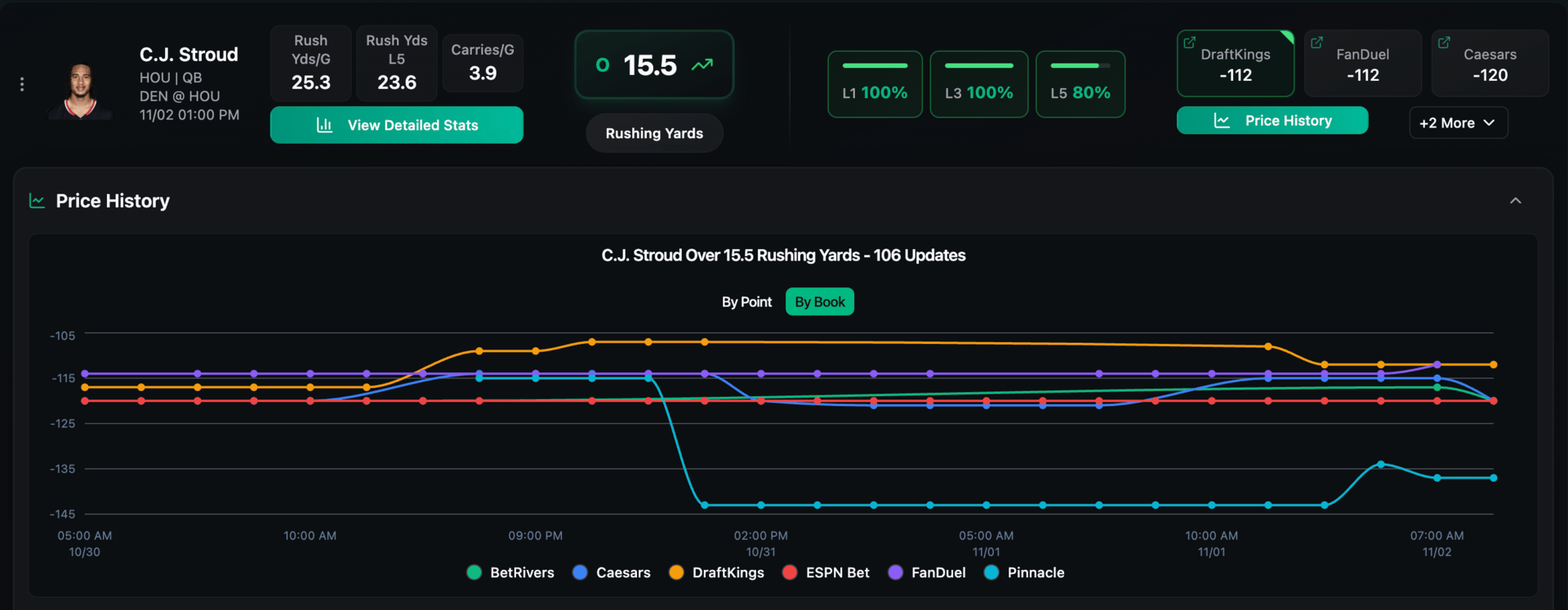 C.J. Stroud’s rushing line of 15.5 yards looks like a strong over spot given his recent consistency and efficiency. He’s averaged 25.3 rushing yards per game this season and has gone over this number in four of his last five, including three straight. Over that stretch, he’s averaging 3.86 carries per game and an impressive 6.6 yards per carry, showing both confidence and burst when escaping the pocket. The matchup also works in his favor, Denver has allowed multiple quarterbacks to clear this line this season, struggling to contain scrambles on broken plays. With Stroud’s growing comfort extending drives with his legs, 15.5 feels like a modest hurdle in a game where he should have room to run.