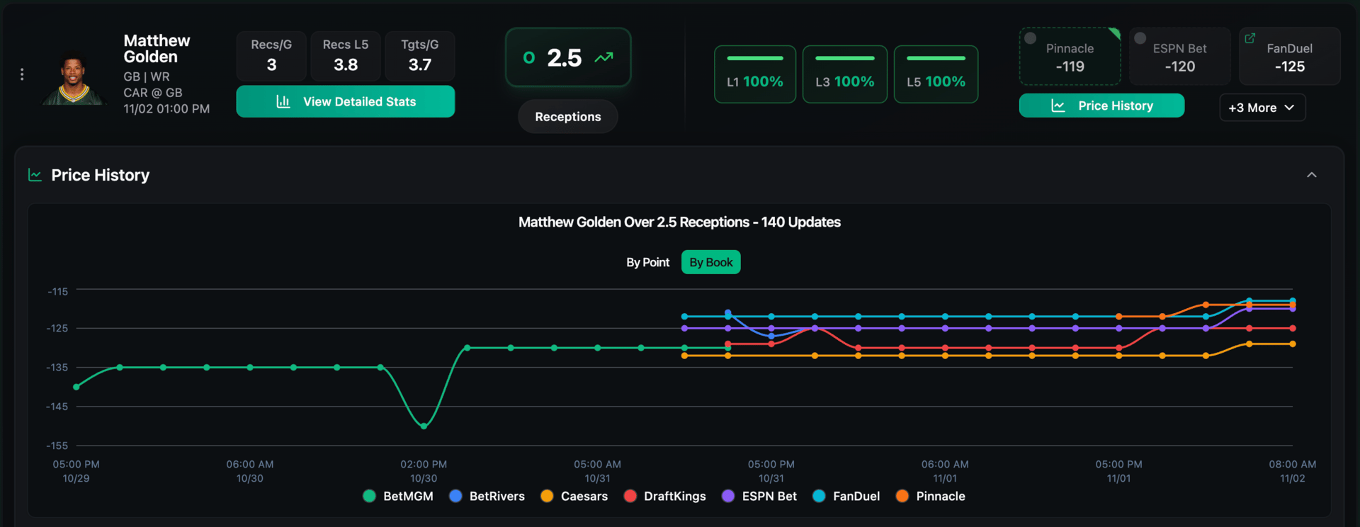 Matthew Golden’s receptions line of 2.5 looks like a solid over play based on both usage and consistency. He’s averaging 3 catches per game on the season and has gone over this number in five straight, including three in his most recent outing. Over his last five games, Golden has averaged 3.8 receptions, showing steady involvement in the passing game regardless of matchup. His chemistry with the quarterback continues to build, and his routes have been diversified to include both short and intermediate looks, giving him multiple paths to production. With his recent trend of consistency and a modest line set below his season average, the over holds clear value.