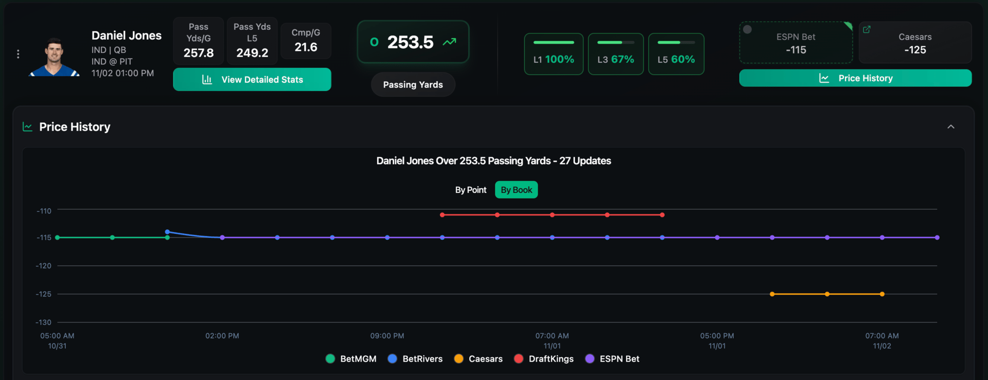 Daniel Jones’ passing line of 253.5 yards looks like a strong over opportunity based on both consistency and matchup. He’s averaging 257.8 yards per game on the season, with 257.3 over his last three and 249.2 across his last five, showing a steady floor of production. Jones has cleared this number in two of his last three and just hit 272 yards in his most recent outing. He’s averaging just over 30 pass attempts per game at 8.7 yards per completion, maintaining efficient downfield production. The matchup adds more upside, the Steelers are allowing the most passing yards per game in the NFL, often getting burned by explosive plays and struggling to contain intermediate routes. With Jones’ recent rhythm and the defense’s weaknesses, this line appears several yards too low.